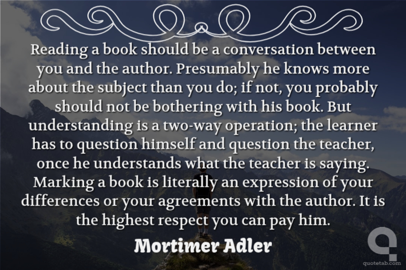 Reading a book should be a conversation between you and the author. Presumably he knows more about the subject than you do; if not, you probably should not be bothering with his book. But understanding is a two-way operation; the learner has to question himself and question the teacher, once he understands what the teacher is saying. Marking a book is literally an expression of your differences or your agreements with the author. It is the highest respect you can pay him.