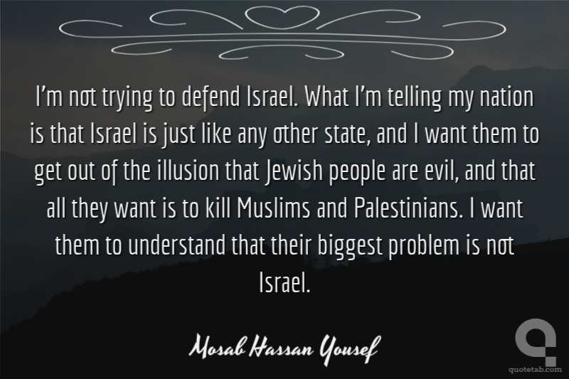 I'm not trying to defend Israel. What I'm telling my nation is that Israel is just like any other state, and I want them to get out of the illusion that Jewish people are evil, and that all they want is to kill Muslims and Palestinians. I want them to understand that their biggest problem is not Israel.