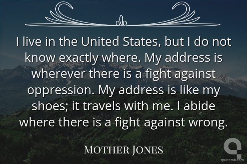 I live in the United States, but I do not know exactly where. My address is wherever there is a fight against oppression. My address is like my shoes; it travels with me. I abide where there is a fight against wrong.