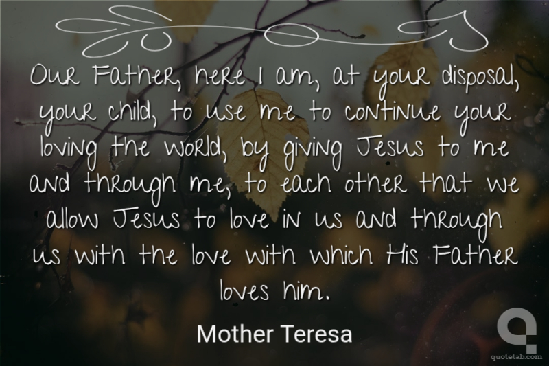 Our Father, here I am, at your disposal, your child, to use me to continue your loving the world, by giving Jesus to me and through me, to each other that we allow Jesus to love in us and through us with the love with which His Father loves him.