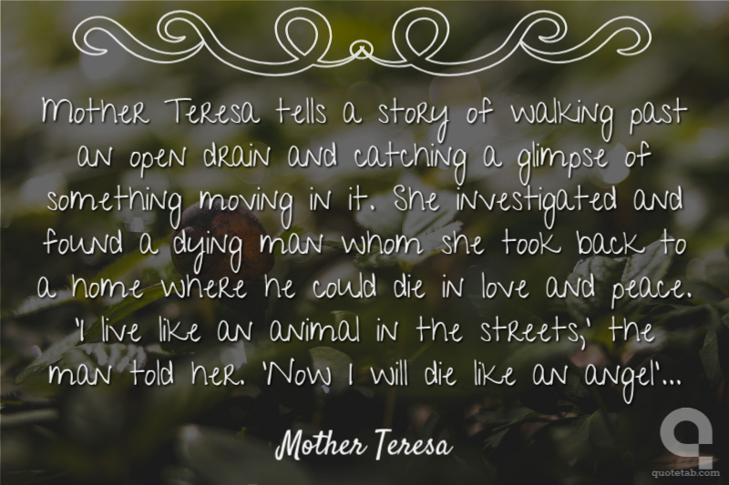 Mother Teresa tells a story of walking past an open drain and catching a glimpse of something moving in it. She investigated and found a dying man whom she took back to a home where he could die in love and peace. 'I live like an animal in the streets,' the man told her. 'Now I will die like an angel'...