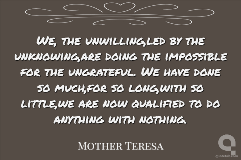 We, the unwilling,led by the unknowing,are doing the impossible for the ungrateful. We have done so much,for so long,with so little,we are now qualified to do anything with nothing.