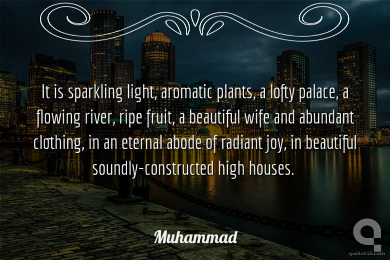 It is sparkling light, aromatic plants, a lofty palace, a flowing river, ripe fruit, a beautiful wife and abundant clothing, in an eternal abode of radiant joy, in beautiful soundly-constructed high houses.