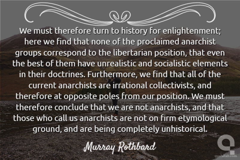We must therefore turn to history for enlightenment; here we find that none of the proclaimed anarchist groups correspond to the libertarian position, that even the best of them have unrealistic and socialistic elements in their doctrines. Furthermore, we find that all of the current anarchists are irrational collectivists, and therefore at opposite poles from our position. We must therefore conclude that we are not anarchists, and that those who call us anarchists are not on firm etymological ground, and are being completely unhistorical.