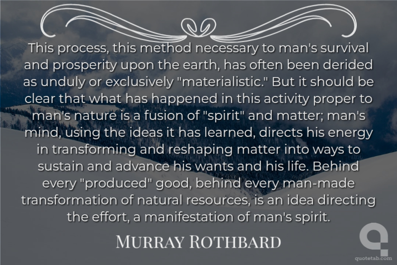 This process, this method necessary to man's survival and prosperity upon the earth, has often been derided as unduly or exclusively "materialistic." But it should be clear that what has happened in this activity proper to man's nature is a fusion of "spirit" and matter; man's mind, using the ideas it has learned, directs his energy in transforming and reshaping matter into ways to sustain and advance his wants and his life. Behind every "produced" good, behind every man-made transformation of natural resources, is an idea directing the effort, a manifestation of man's spirit.