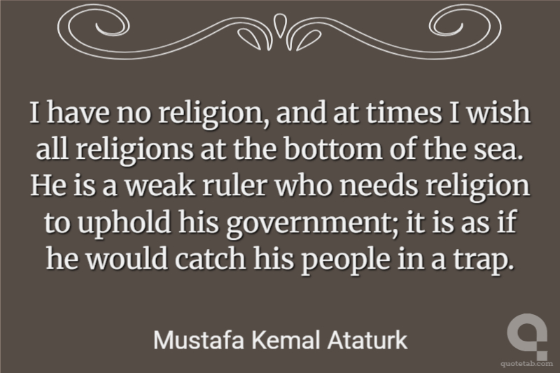I have no religion, and at times I wish all religions at the bottom of the sea. He is a weak ruler who needs religion to uphold his government; it is as if he would catch his people in a trap.