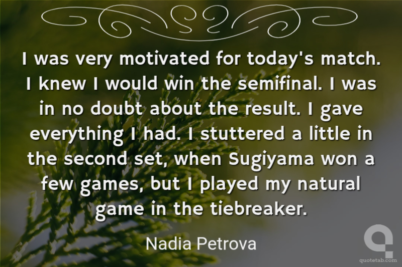 I was very motivated for today's match. I knew I would win the semifinal. I was in no doubt about the result. I gave everything I had. I stuttered a little in the second set, when Sugiyama won a few games, but I played my natural game in the tiebreaker.