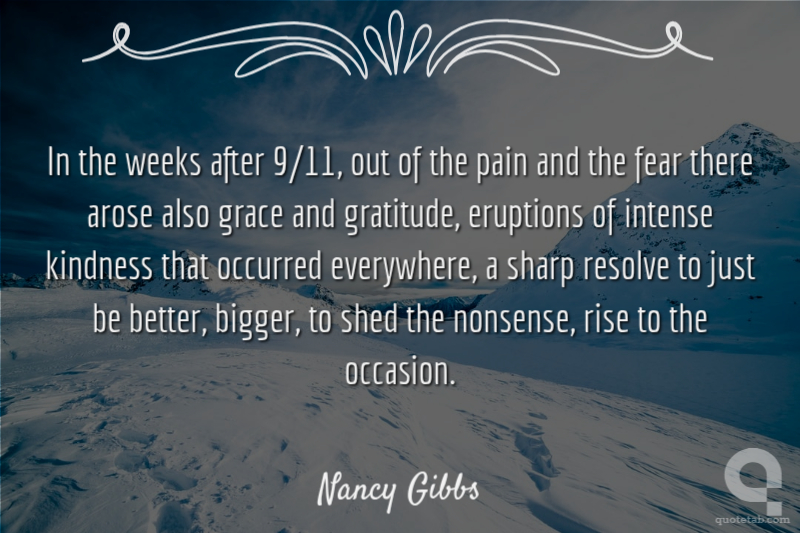 In the weeks after 9/11, out of the pain and the fear there arose also grace and gratitude, eruptions of intense kindness that occurred everywhere, a sharp resolve to just be better, bigger, to shed the nonsense, rise to the occasion.