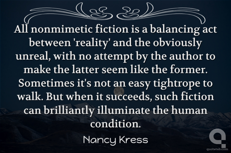 All nonmimetic fiction is a balancing act between 'reality' and the obviously unreal, with no attempt by the author to make the latter seem like the former. Sometimes it's not an easy tightrope to walk. But when it succeeds, such fiction can brilliantly illuminate the human condition.