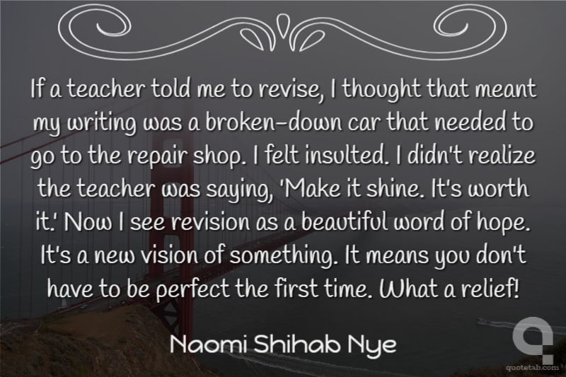 If a teacher told me to revise, I thought that meant my writing was a broken-down car that needed to go to the repair shop. I felt insulted. I didn't realize the teacher was saying, 'Make it shine. It's worth it.' Now I see revision as a beautiful word of hope. It's a new vision of something. It means you don't have to be perfect the first time. What a relief!