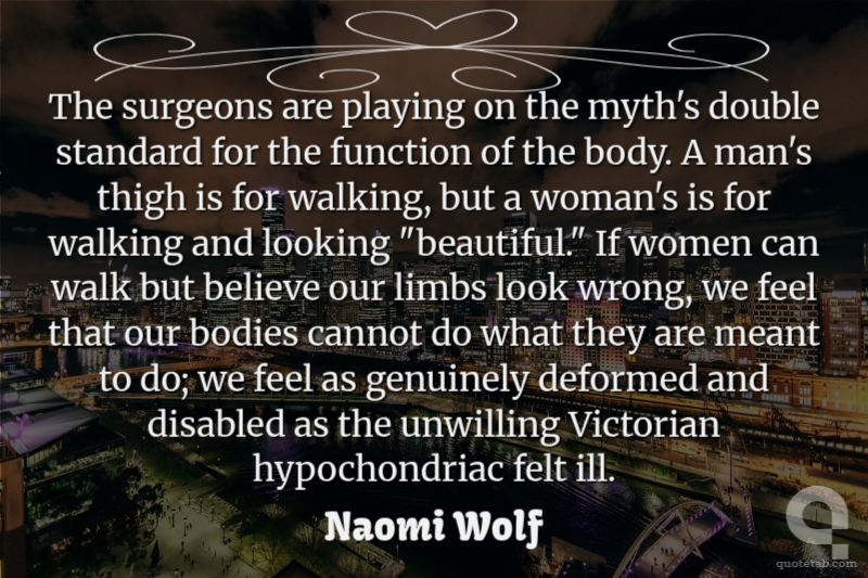 The surgeons are playing on the myth's double standard for the function of the body. A man's thigh is for walking, but a woman's is for walking and looking "beautiful." If women can walk but believe our limbs look wrong, we feel that our bodies cannot do what they are meant to do; we feel as genuinely deformed and disabled as the unwilling Victorian hypochondriac felt ill.