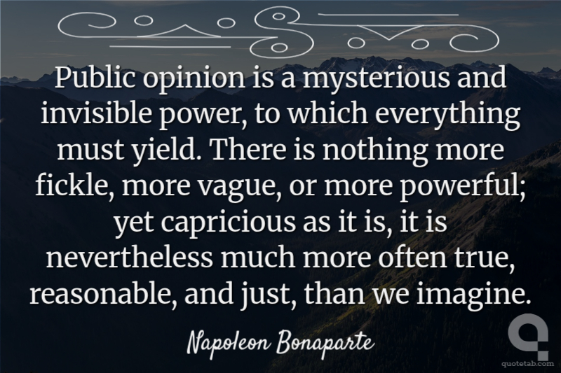 Public opinion is a mysterious and invisible power, to which everything must yield. There is nothing more fickle, more vague, or more powerful; yet capricious as it is, it is nevertheless much more often true, reasonable, and just, than we imagine.