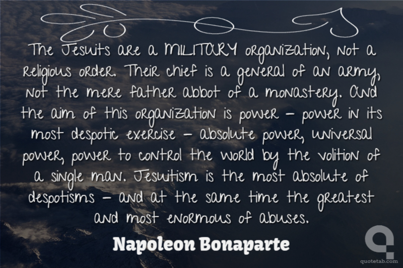 The Jesuits are a MILITARY organization, not a religious order. Their chief is a general of an army, not the mere father abbot of a monastery. And the aim of this organization is power - power in its most despotic exercise - absolute power, universal power, power to control the world by the volition of a single man. Jesuitism is the most absolute of despotisms - and at the same time the greatest and most enormous of abuses.