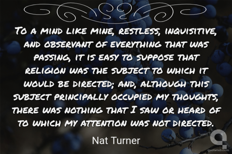 To a mind like mine, restless, inquisitive, and observant of everything that was passing, it is easy to suppose that religion was the subject to which it would be directed; and, although this subject principally occupied my thoughts, there was nothing that I saw or heard of to which my attention was not directed.