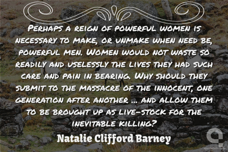 Perhaps a reign of powerful women is necessary to make, or unmake when need be, powerful men. Women would not waste so readily and uselessly the lives they had such care and pain in bearing. Why should they submit to the massacre of the innocent, one generation after another ... and allow them to be brought up as live-stock for the inevitable killing?