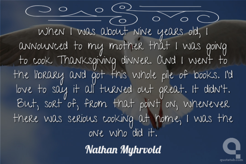 When I was about nine years old, I announced to my mother that I was going to cook Thanksgiving dinner. And I went to the library and got this whole pile of books. I'd love to say it all turned out great. It didn't. But, sort of, from that point on, whenever there was serious cooking at home, I was the one who did it.