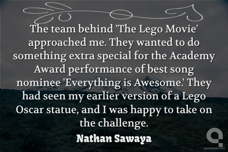 The team behind 'The Lego Movie' approached me. They wanted to do something extra special for the Academy Award performance of best song nominee 'Everything is Awesome.' They had seen my earlier version of a Lego Oscar statue, and I was happy to take on the challenge.