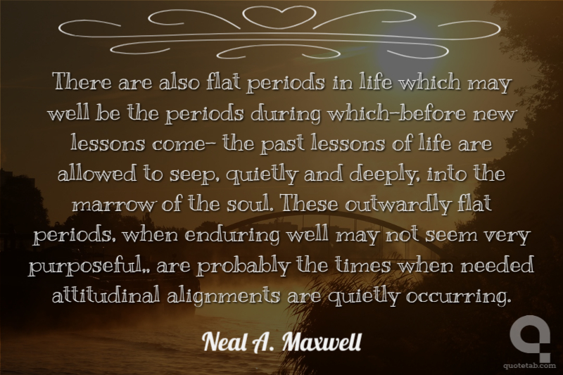 There are also flat periods in life which may well be the periods during which-before new lessons come- the past lessons of life are allowed to seep, quietly and deeply, into the marrow of the soul. These outwardly flat periods, when enduring well may not seem very purposeful,, are probably the times when needed attitudinal alignments are quietly occurring.
