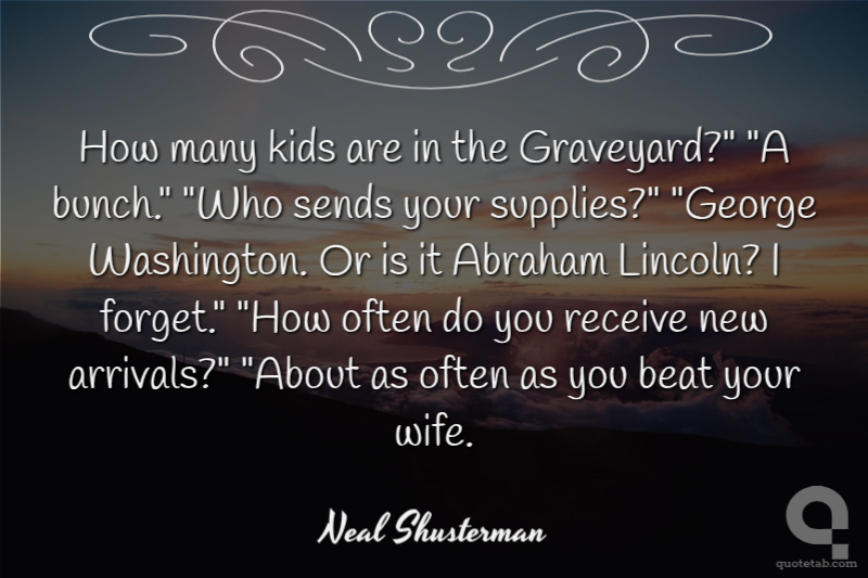 How many kids are in the Graveyard?" "A bunch." "Who sends your supplies?" "George Washington. Or is it Abraham Lincoln? I forget." "How often do you receive new arrivals?" "About as often as you beat your wife.