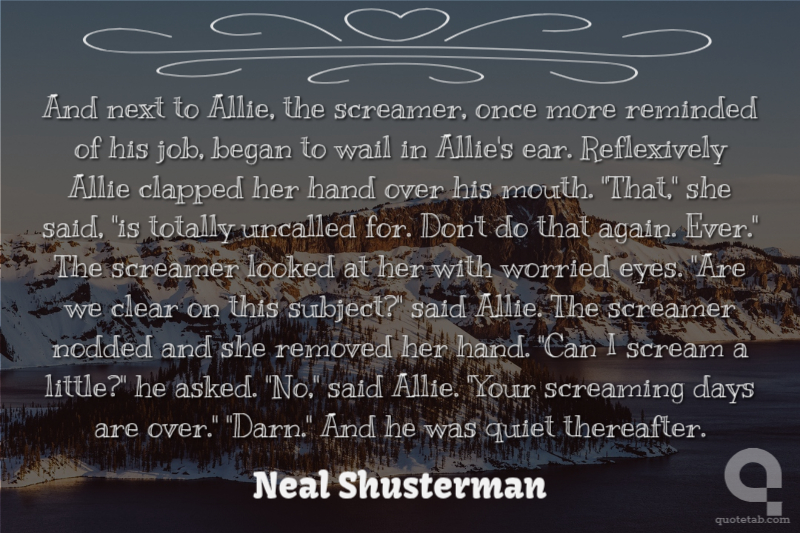 And next to Allie, the screamer, once more reminded of his job, began to wail in Allie's ear. Reflexively Allie clapped her hand over his mouth. "That," she said, "is totally uncalled for. Don't do that again. Ever." The screamer looked at her with worried eyes. "Are we clear on this subject?" said Allie. The screamer nodded and she removed her hand. "Can I scream a little?" he asked. "No," said Allie. "Your screaming days are over." "Darn." And he was quiet thereafter.