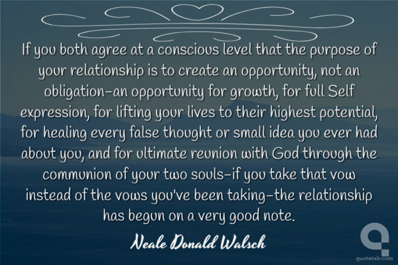 If you both agree at a conscious level that the purpose of your relationship is to create an opportunity, not an obligation-an opportunity for growth, for full Self expression, for lifting your lives to their highest potential, for healing every false thought or small idea you ever had about you, and for ultimate reunion with God through the communion of your two souls-if you take that vow instead of the vows you've been taking-the relationship has begun on a very good note.