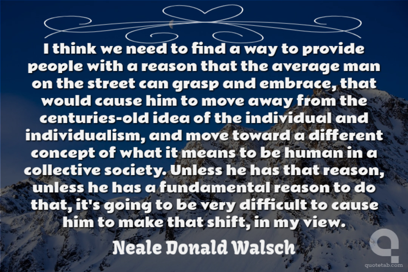 I think we need to find a way to provide people with a reason that the average man on the street can grasp and embrace, that would cause him to move away from the centuries-old idea of the individual and individualism, and move toward a different concept of what it means to be human in a collective society. Unless he has that reason, unless he has a fundamental reason to do that, it's going to be very difficult to cause him to make that shift, in my view.
