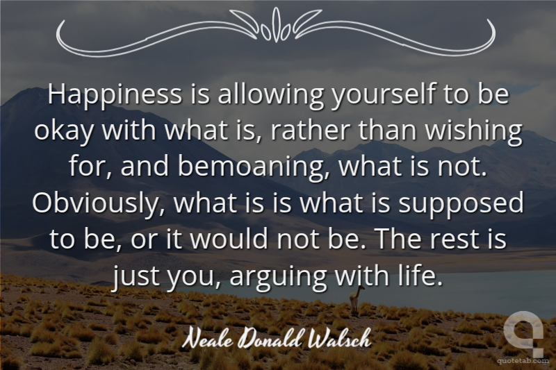 Happiness is allowing yourself to be okay with what is, rather than wishing for, and bemoaning, what is not. Obviously, what is is what is supposed to be, or it would not be. The rest is just you, arguing with life.