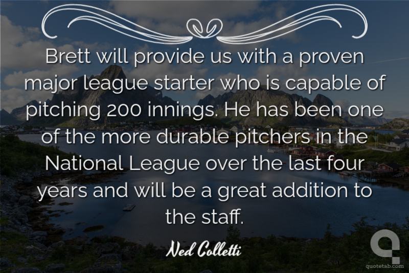 Brett will provide us with a proven major league starter who is capable of pitching 200 innings. He has been one of the more durable pitchers in the National League over the last four years and will be a great addition to the staff.