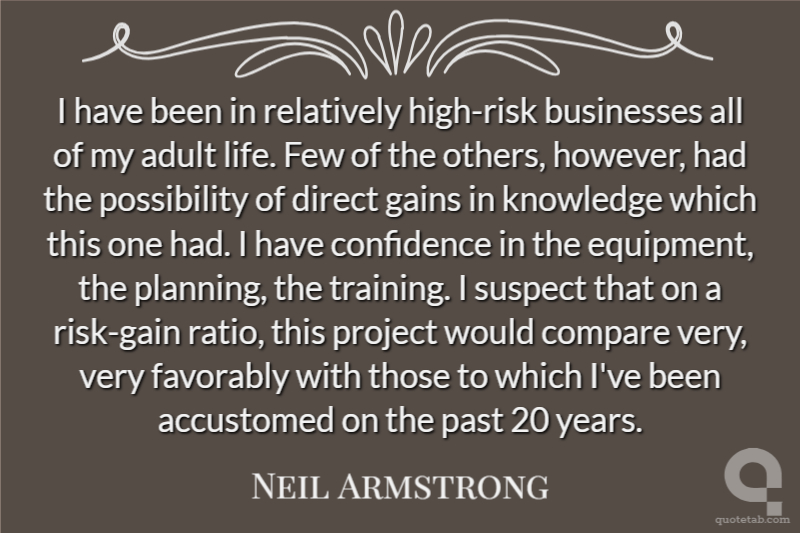 I have been in relatively high-risk businesses all of my adult life. Few of the others, however, had the possibility of direct gains in knowledge which this one had. I have confidence in the equipment, the planning, the training. I suspect that on a risk-gain ratio, this project would compare very, very favorably with those to which I've been accustomed on the past 20 years.