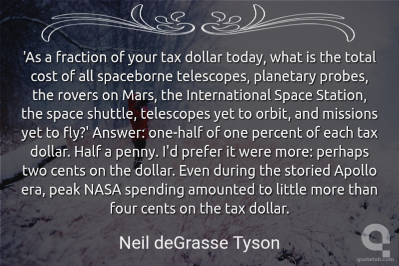 'As a fraction of your tax dollar today, what is the total cost of all spaceborne telescopes, planetary probes, the rovers on Mars, the International Space Station, the space shuttle, telescopes yet to orbit, and missions yet to fly?' Answer: one-half of one percent of each tax dollar. Half a penny. I'd prefer it were more: perhaps two cents on the dollar. Even during the storied Apollo era, peak NASA spending amounted to little more than four cents on the tax dollar.