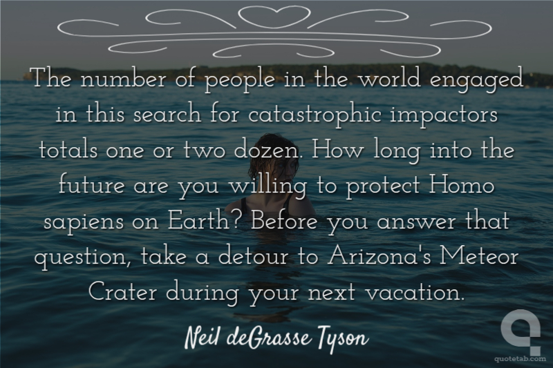 The number of people in the world engaged in this search for catastrophic impactors totals one or two dozen. How long into the future are you willing to protect Homo sapiens on Earth? Before you answer that question, take a detour to Arizona's Meteor Crater during your next vacation.