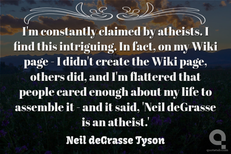 I'm constantly claimed by atheists. I find this intriguing. In fact, on my Wiki page - I didn't create the Wiki page, others did, and I'm flattered that people cared enough about my life to assemble it - and it said, 'Neil deGrasse is an atheist.'