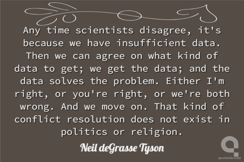 Any time scientists disagree, it's because we have insufficient data. Then we can agree on what kind of data to get; we get the data; and the data solves the problem. Either I'm right, or you're right, or we're both wrong. And we move on. That kind of conflict resolution does not exist in politics or religion.