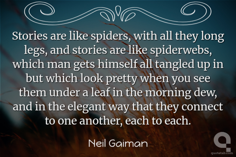 Stories are like spiders, with all they long legs, and stories are like spiderwebs, which man gets himself all tangled up in but which look pretty when you see them under a leaf in the morning dew, and in the elegant way that they connect to one another, each to each.