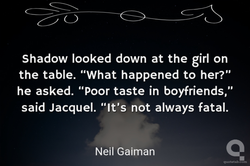 Shadow looked down at the girl on the table. “What happened to her?” he asked. “Poor taste in boyfriends,” said Jacquel. “It’s not always fatal.