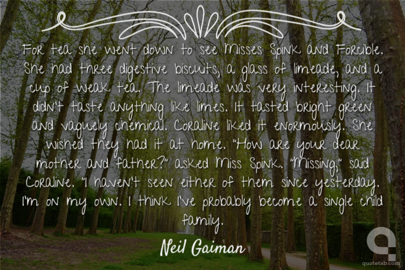 For tea she went down to see Misses Spink and Forcible. She had three digestive biscuits, a glass of limeade, and a cup of weak tea. The limeade was very interesting. It didn't taste anything like limes. It tasted bright green and vaguely chemical. Coraline liked it enormously. She wished they had it at home. "How are your dear mother and father?" asked Miss Spink. "Missing," said Coraline. "I haven't seen either of them since yesterday. I'm on my own. I think I've probably become a single child family.