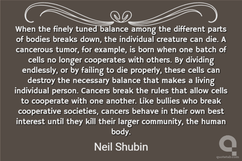 When the finely tuned balance among the different parts of bodies breaks down, the individual creature can die. A cancerous tumor, for example, is born when one batch of cells no longer cooperates with others. By dividing endlessly, or by failing to die properly, these cells can destroy the necessary balance that makes a living individual person. Cancers break the rules that allow cells to cooperate with one another. Like bullies who break cooperative societies, cancers behave in their own best interest until they kill their larger community, the human body.