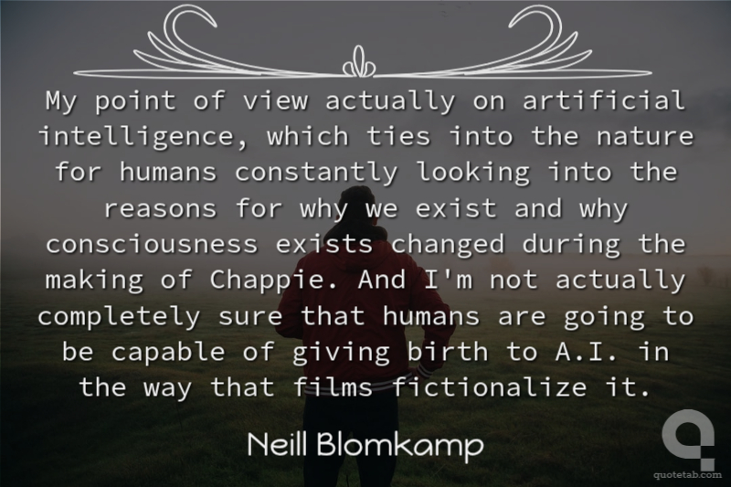 My point of view actually on artificial intelligence, which ties into the nature for humans constantly looking into the reasons for why we exist and why consciousness exists changed during the making of Chappie. And I'm not actually completely sure that humans are going to be capable of giving birth to A.I. in the way that films fictionalize it.