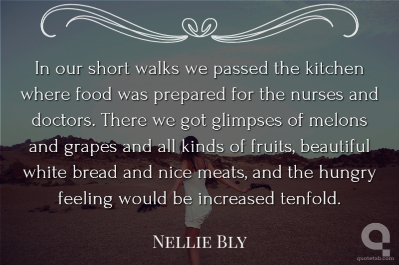 In our short walks we passed the kitchen where food was prepared for the nurses and doctors. There we got glimpses of melons and grapes and all kinds of fruits, beautiful white bread and nice meats, and the hungry feeling would be increased tenfold.