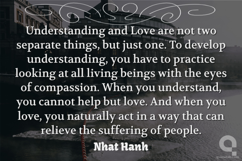 Understanding and Love are not two separate things, but just one. To develop understanding, you have to practice looking at all living beings with the eyes of compassion. When you understand, you cannot help but love. And when you love, you naturally act in a way that can relieve the suffering of people.