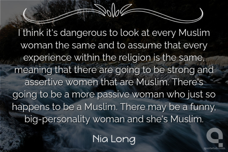 I think it's dangerous to look at every Muslim woman the same and to assume that every experience within the religion is the same, meaning that there are going to be strong and assertive women that are Muslim. There's going to be a more passive woman who just so happens to be a Muslim. There may be a funny, big-personality woman and she's Muslim.
