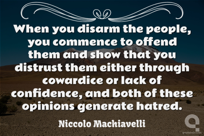 When you disarm the people, you commence to offend them and show that you distrust them either through cowardice or lack of confidence, and both of these opinions generate hatred.
