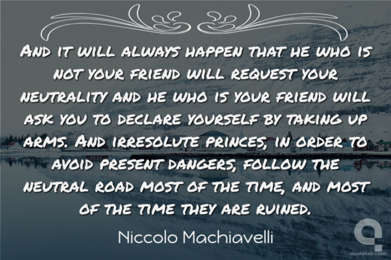 And it will always happen that he who is not your friend will request your neutrality and he who is your friend will ask you to declare yourself by taking up arms. And irresolute princes, in order to avoid present dangers, follow the neutral road most of the time, and most of the time they are ruined.