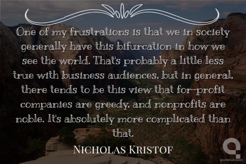 One of my frustrations is that we in society generally have this bifurcation in how we see the world. That's probably a little less true with business audiences, but in general, there tends to be this view that for-profit companies are greedy, and nonprofits are noble. It's absolutely more complicated than that.