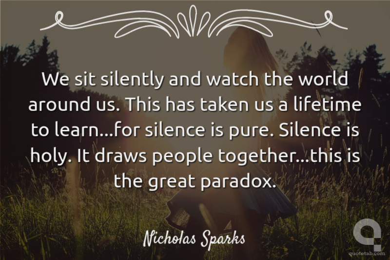 We sit silently and watch the world around us. This has taken us a lifetime to learn...for silence is pure. Silence is holy. It draws people together...this is the great paradox.