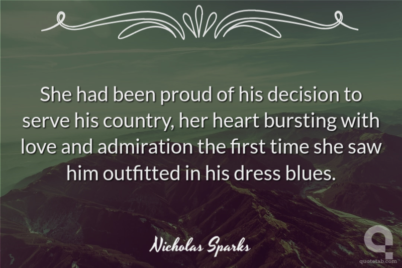 She had been proud of his decision to serve his country, her heart bursting with love and admiration the first time she saw him outfitted in his dress blues.