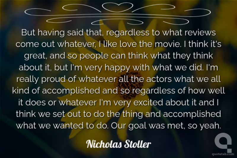 But having said that, regardless to what reviews come out whatever, I like love the movie. I think it's great, and so people can think what they think about it, but I'm very happy with what we did. I'm really proud of whatever all the actors what we all kind of accomplished and so regardless of how well it does or whatever I'm very excited about it and I think we set out to do the thing and accomplished what we wanted to do. Our goal was met, so yeah.