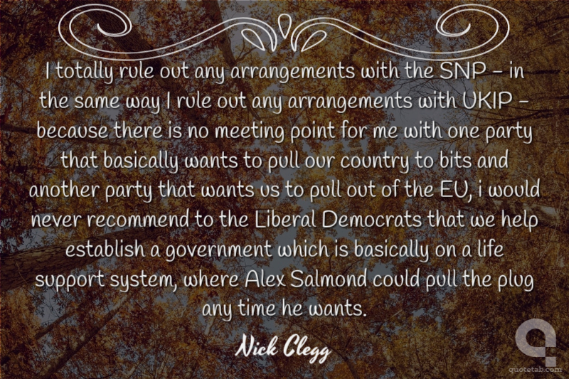 I totally rule out any arrangements with the SNP - in the same way I rule out any arrangements with UKIP - because there is no meeting point for me with one party that basically wants to pull our country to bits and another party that wants us to pull out of the EU, i would never recommend to the Liberal Democrats that we help establish a government which is basically on a life support system, where Alex Salmond could pull the plug any time he wants.