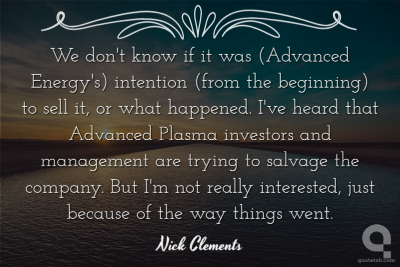 We don't know if it was (Advanced Energy's) intention (from the beginning) to sell it, or what happened. I've heard that Advanced Plasma investors and management are trying to salvage the company. But I'm not really interested, just because of the way things went.