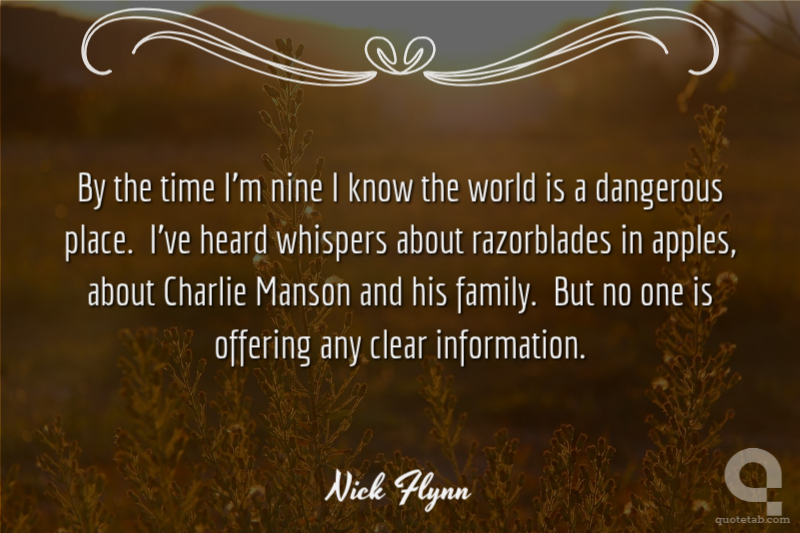 By the time I'm nine I know the world is a dangerous place. I've heard whispers about razorblades in apples, about Charlie Manson and his family. But no one is offering any clear information.